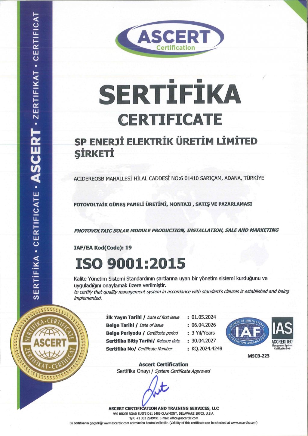 ISO 9001:2015 Kalite Yönetim Sistemi Belgesi